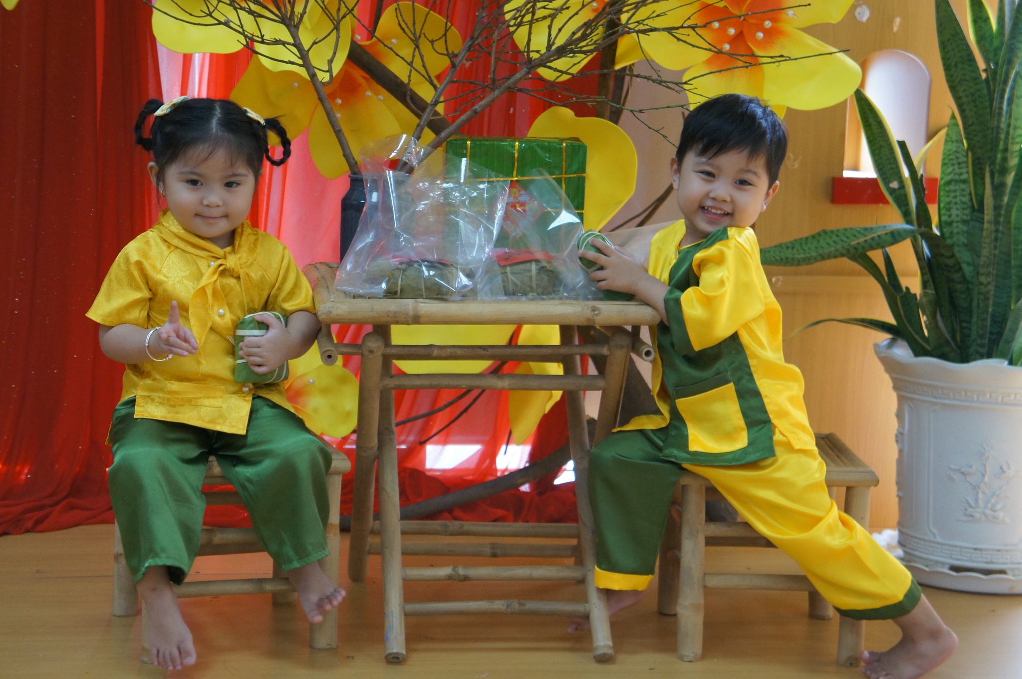Tại Kindy Garden, không gian lớp học được trang trí như một góc Tết xưa với chõng tre và mai vàng rực rỡ. Quy trình được các cô hướng dẫn tỉ mỉ để đảm bảo mỗi bé đều là chủ thể của hoạt động: