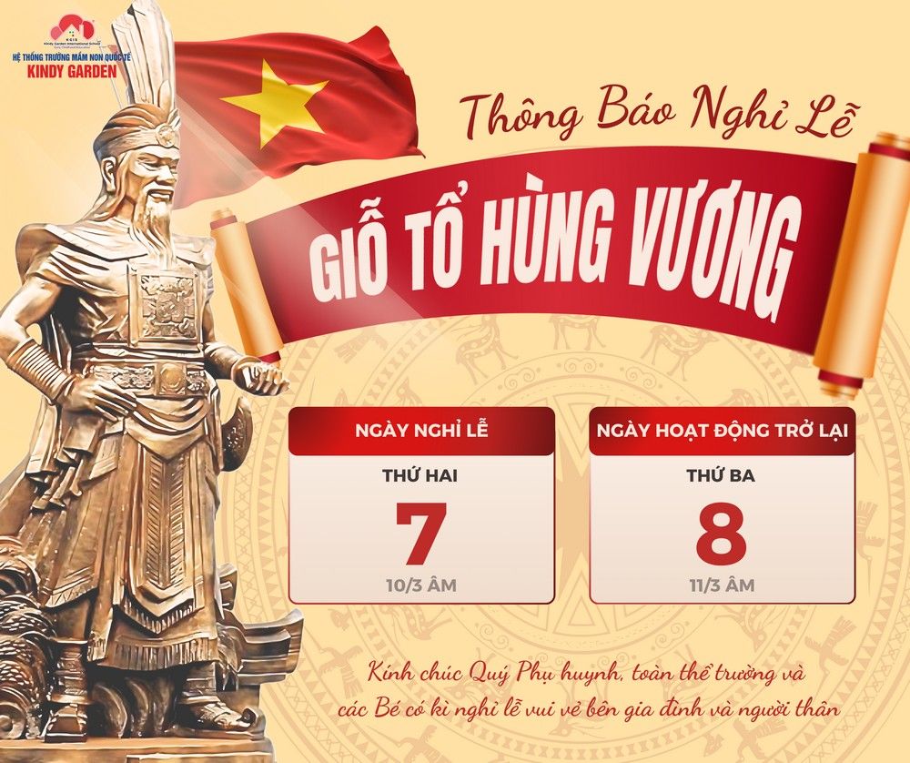 Hệ thống trường mầm non quốc tế Kindy Garden xin thông báo lịch nghỉ lễ Giỗ Tổ Hùng Vương như sau :